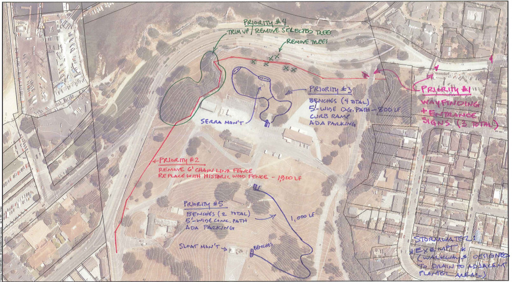 - Priority #2, $100,000 is removal of the existing chain link fencing above Lighthouse Avenue, replacing the fencing with historic wood fencing. New fencing to use existing fence post holes.
