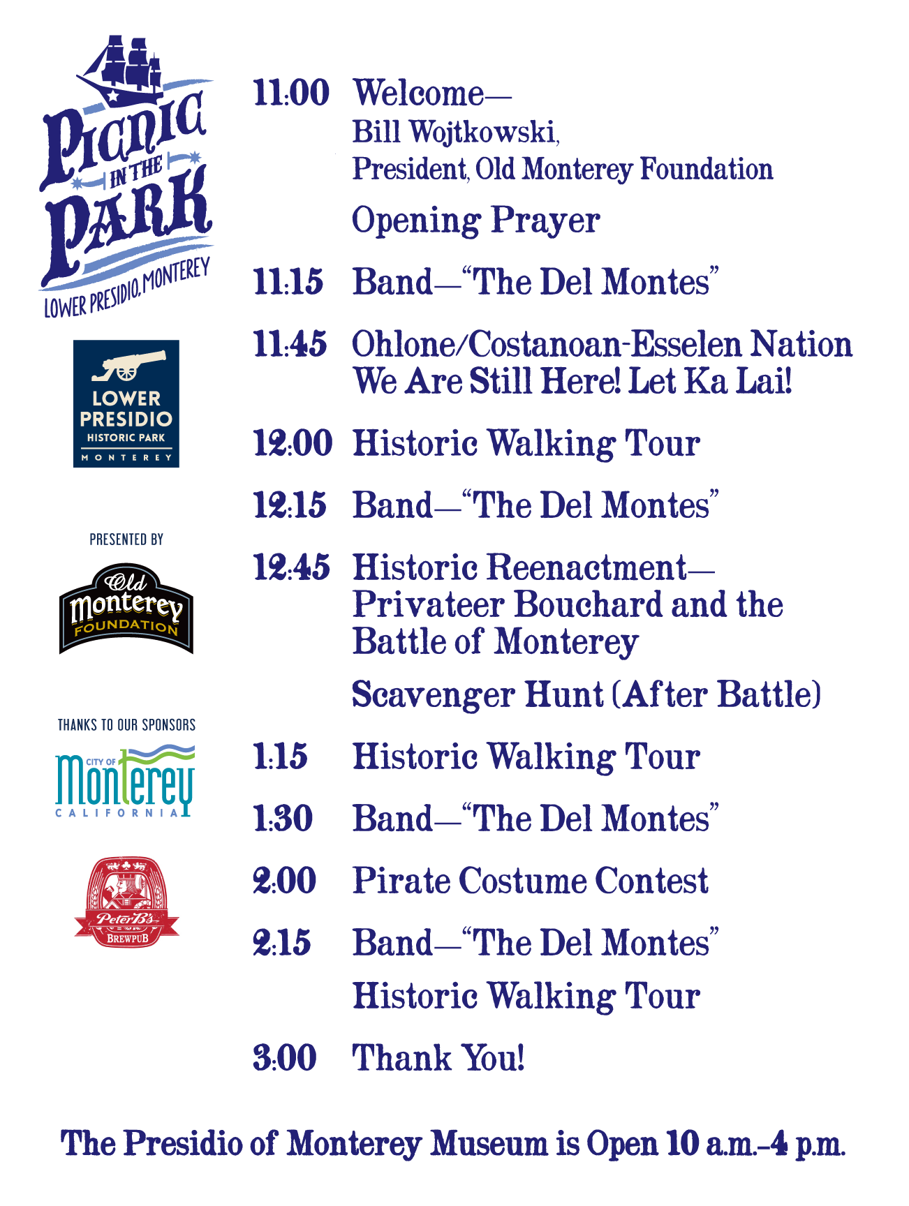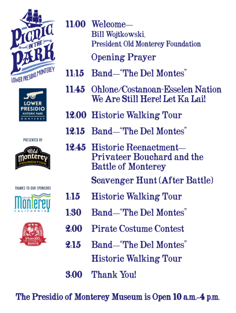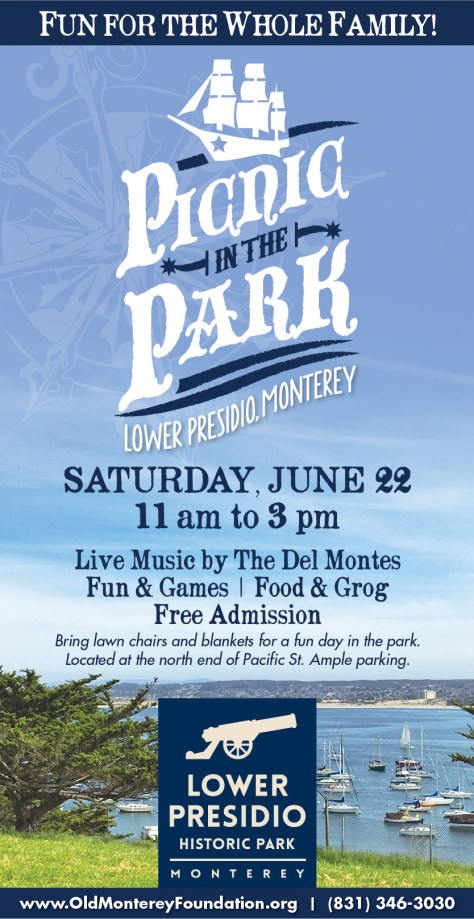 Old Monterey Foundation will hold the “Picnic in the Park” at Lower Presidio Historic Park on Saturday, June 22, 2019 from 11 am to 3 pm. Bring your friends and family to this fun event and enjoy great food, live entertainment, historic reenactments, walking tours, costume contests, scavenger hunt, prizes and much more. Don’t miss this free family-friendly event!
